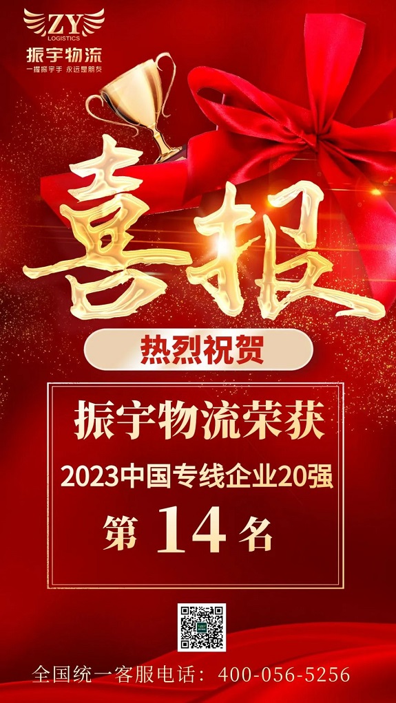 熱烈祝賀振宇物流榮獲2023中國專線企業20強第14名