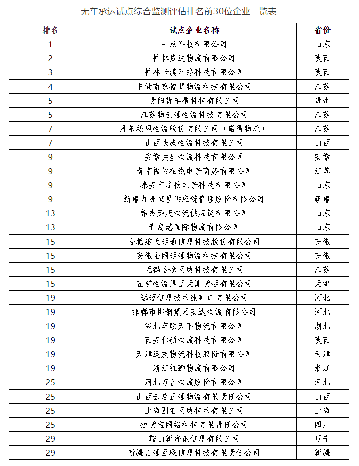 無車試點排名前30的,50%以上都是跟大宗運輸相關