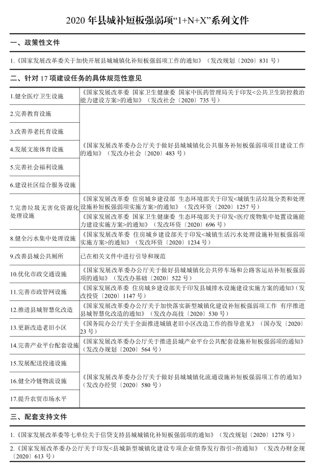 2020年5月29日,國家發展改革委印發《關于加快開展縣城城鎮化補短板強弱項工作的通知》,聚焦縣城及縣級市城區,兼顧鎮區常住人口10萬以上的非縣級政府駐地特大鎮、2015年以來“縣改區”“市改區”形成的地級及以上城市市轄區,將公共服務設施、環境衛生設施、市政公用設施、產業培育設施4大領域共17項建設任務作為建設重點,明確了總體要求、主要任務、要素保障和組織實施方式,公布了縣城城鎮化補短板強弱項項目范疇和縣城新型城鎮化建設示范地區名單。