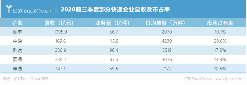 億歐EqualOcean從國家郵政局獲悉,2020年中通、韻達、圓通、申通、順豐所占市場份額分別為20.4%、17.02%、15.18%、10.58%和9.8%。與2020年前三季度相比數據波動不明顯,各家市場表現平分秋色。