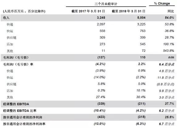 5月10日,百世集團公布2018年第一季度未經審計財務業績:一季度總收入50.04億元人民幣,同比增長54%;毛利潤1.1億元人民幣,與去年同期相比提升6.4%。